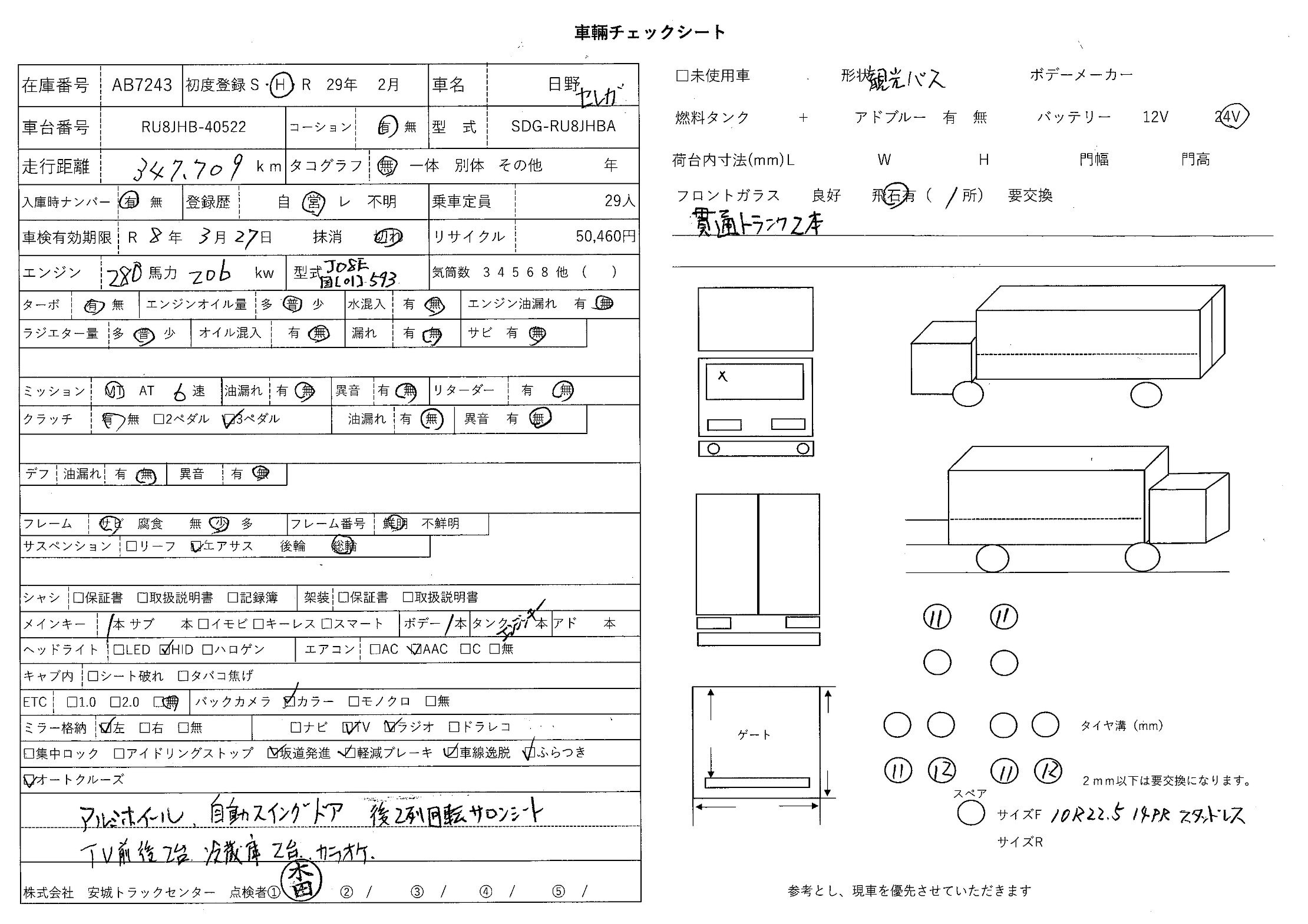 | 備考 | アルミホイール 自動スイングドア 後2列回転サロンシート TV前後2台 冷蔵庫2台 カラオケ 貫通トランク2本 総輪エアサス バックアイカメラ |