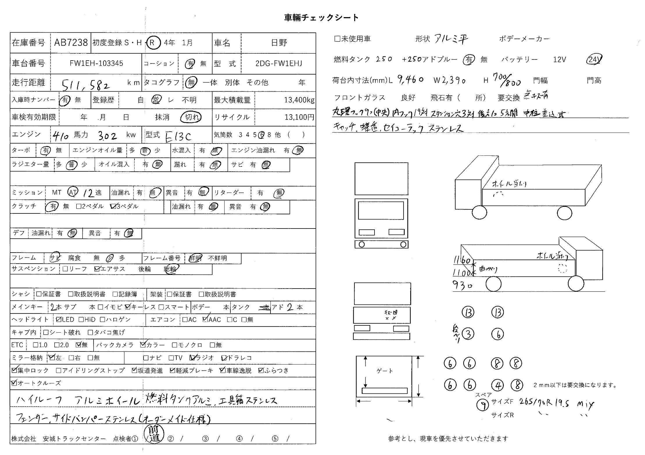 | 備考 | ハイルーフ 総輪エアサス アルミホイール 燃料タンクアルミ 工具箱ステンレス フェンダー、サイドバンパーステンレス(オーダーメイド仕様) 丸環フック9ヶ(中央)内フック19対 スタンション穴3対 後方1ヶ 5方開 中柱差込式 キャッチ、蝶番、セイコーラックステンレス バックアイカメラ |