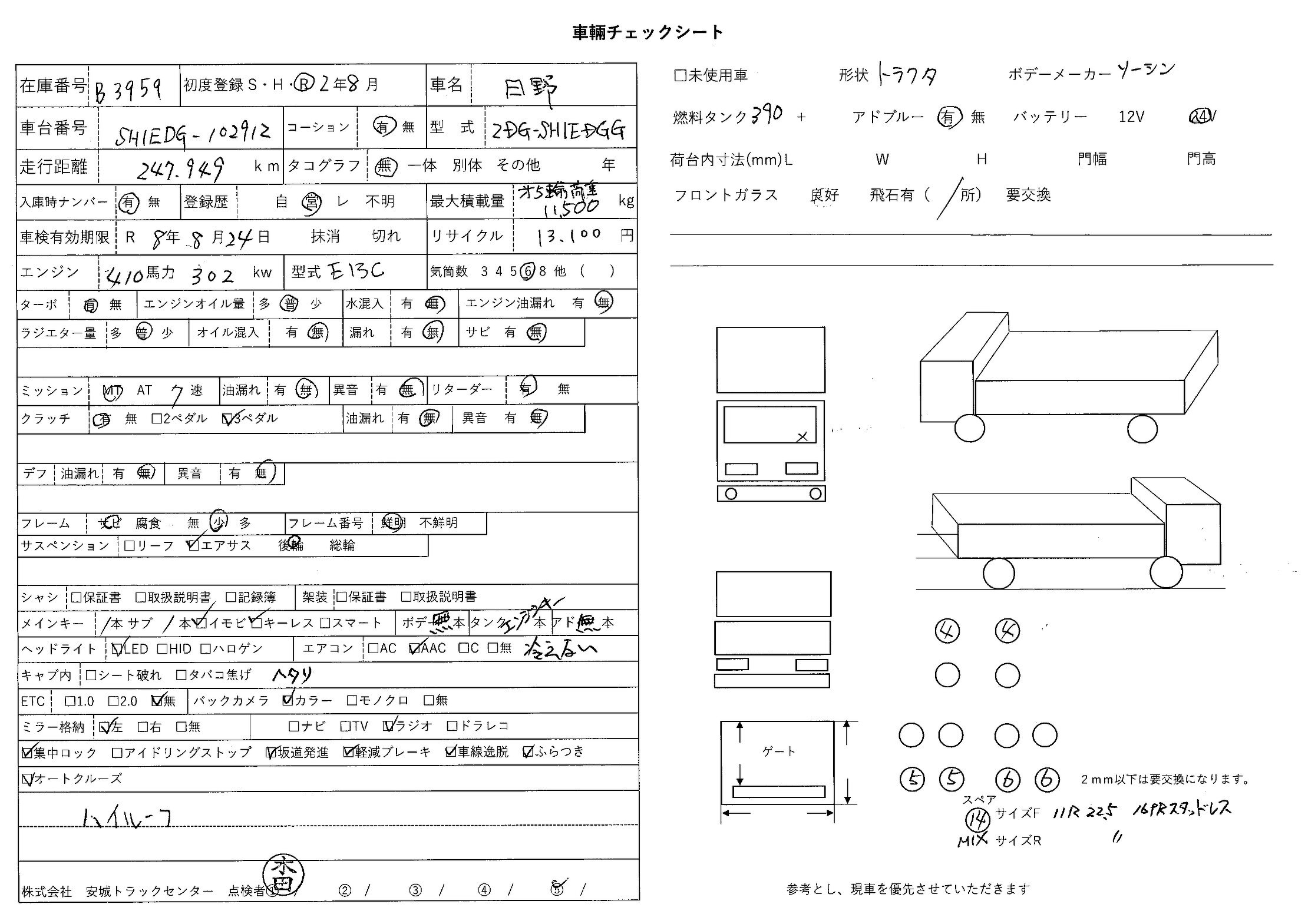 | 備考 | ソーシン ハイルーフ 後輪エアサス 電磁リターダ バックアイカメラ |