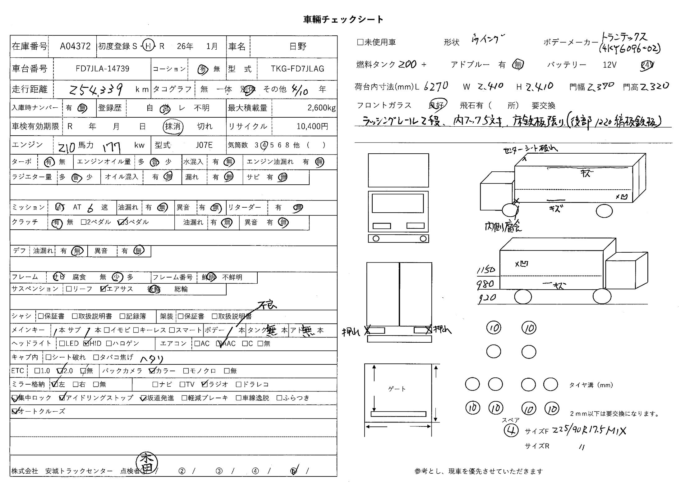 | 備考 | 後輪エアサス バックアイカメラ トランテックス(4KY6096-02)ラッシングレール2段 内フック5対 床鉄板張り(後部1220縞板鉄板) |