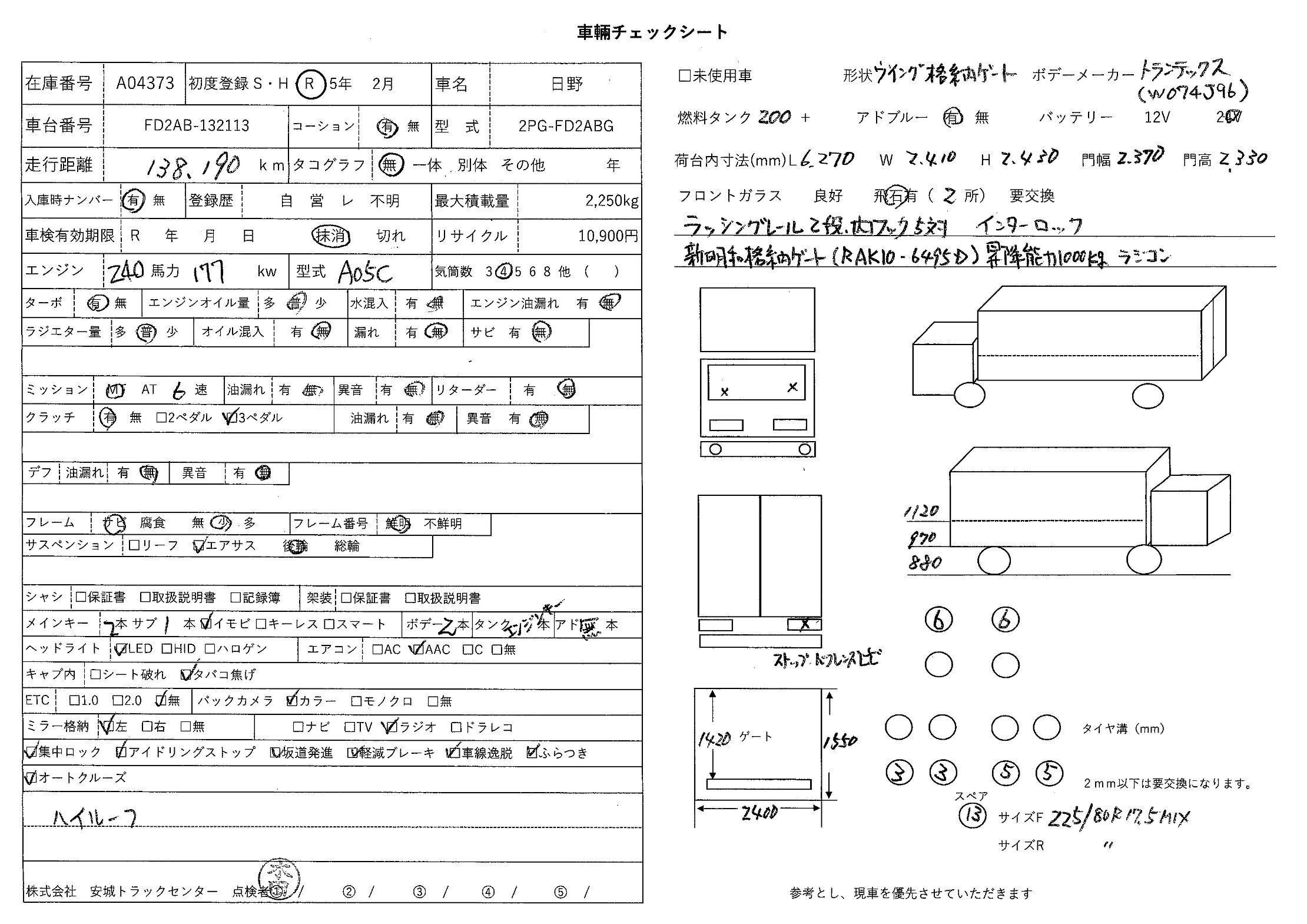 | 備考 | ハイルーフ 後輪エアサス バックアイカメラ トランテックス(W074J96)ラッシングレール2段 内フック5対 インターロック 新明和格納ゲート(RAK10-6495D)昇降能力1000kg ラジコン |