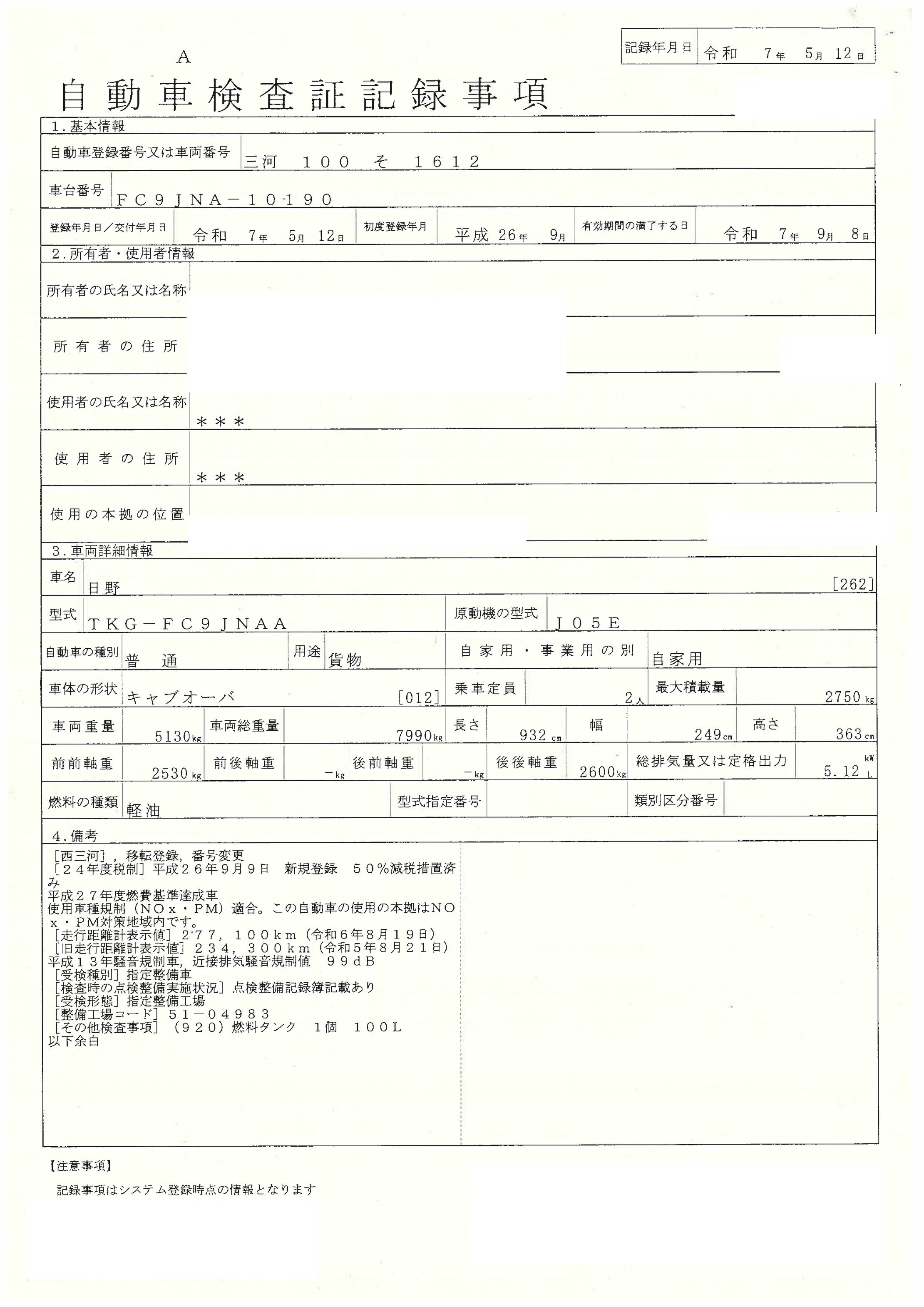 車検証・状態表