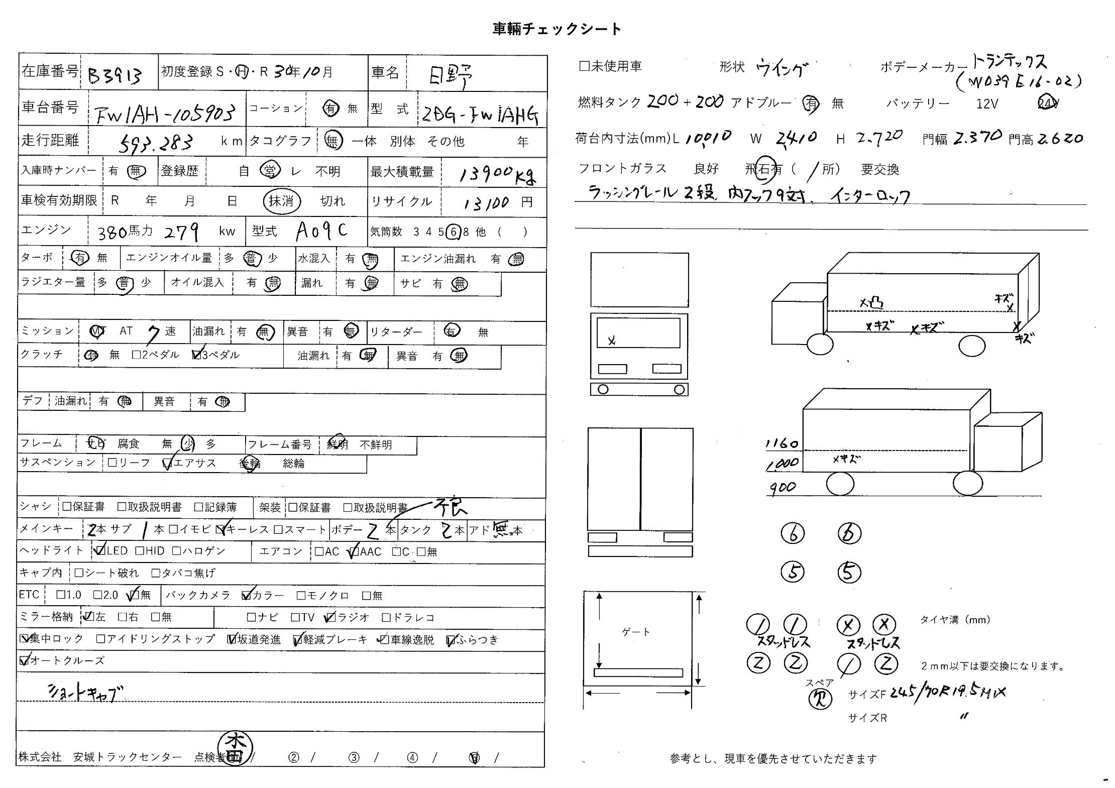 | 備考 | ショートキャブ 後輪エアサス 電磁リターダ バックアイカメラ トランテックス(W039E16-02)ラッシングレール2段 内フック9対 インターロック |