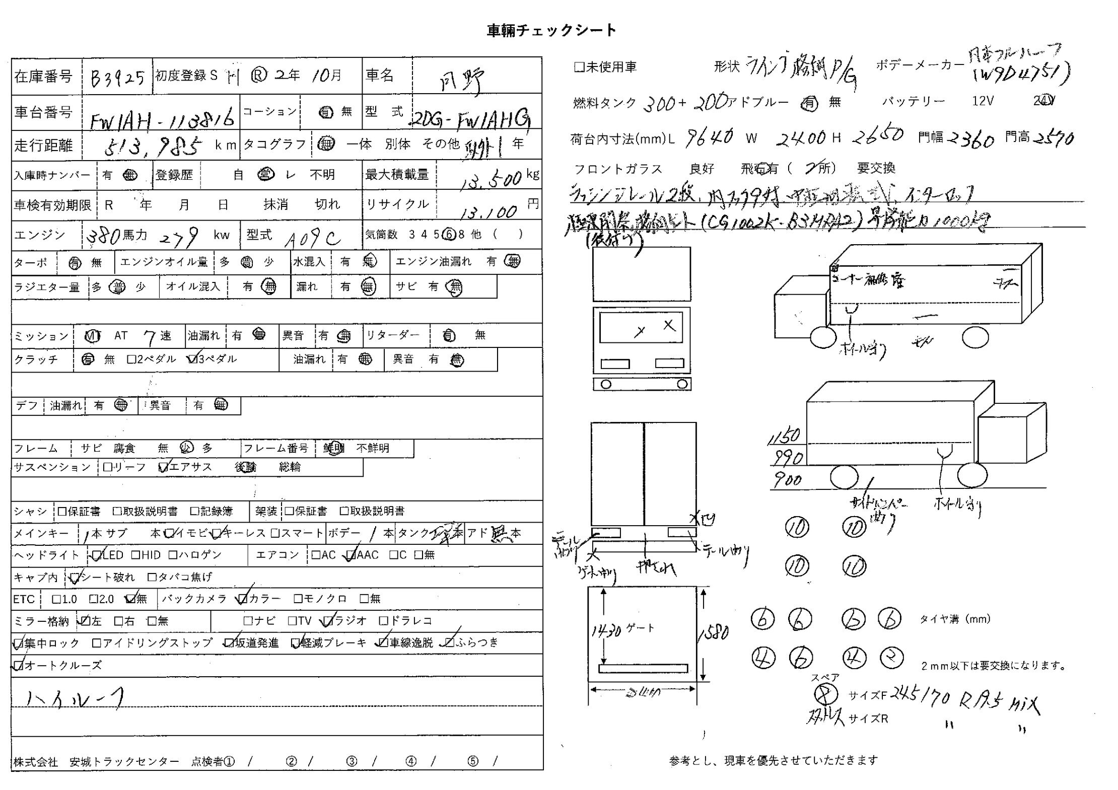 | 備考 | ハイルーフ 後輪エアサス 電磁リターダ バックアイカメラ 日本フルハーフ ラッシグレール2段 内フック9対 中柱回転式 インターロック 極東開発ゲート(後付)(CG1002K-B3MRA2)昇降能力1,000kg |