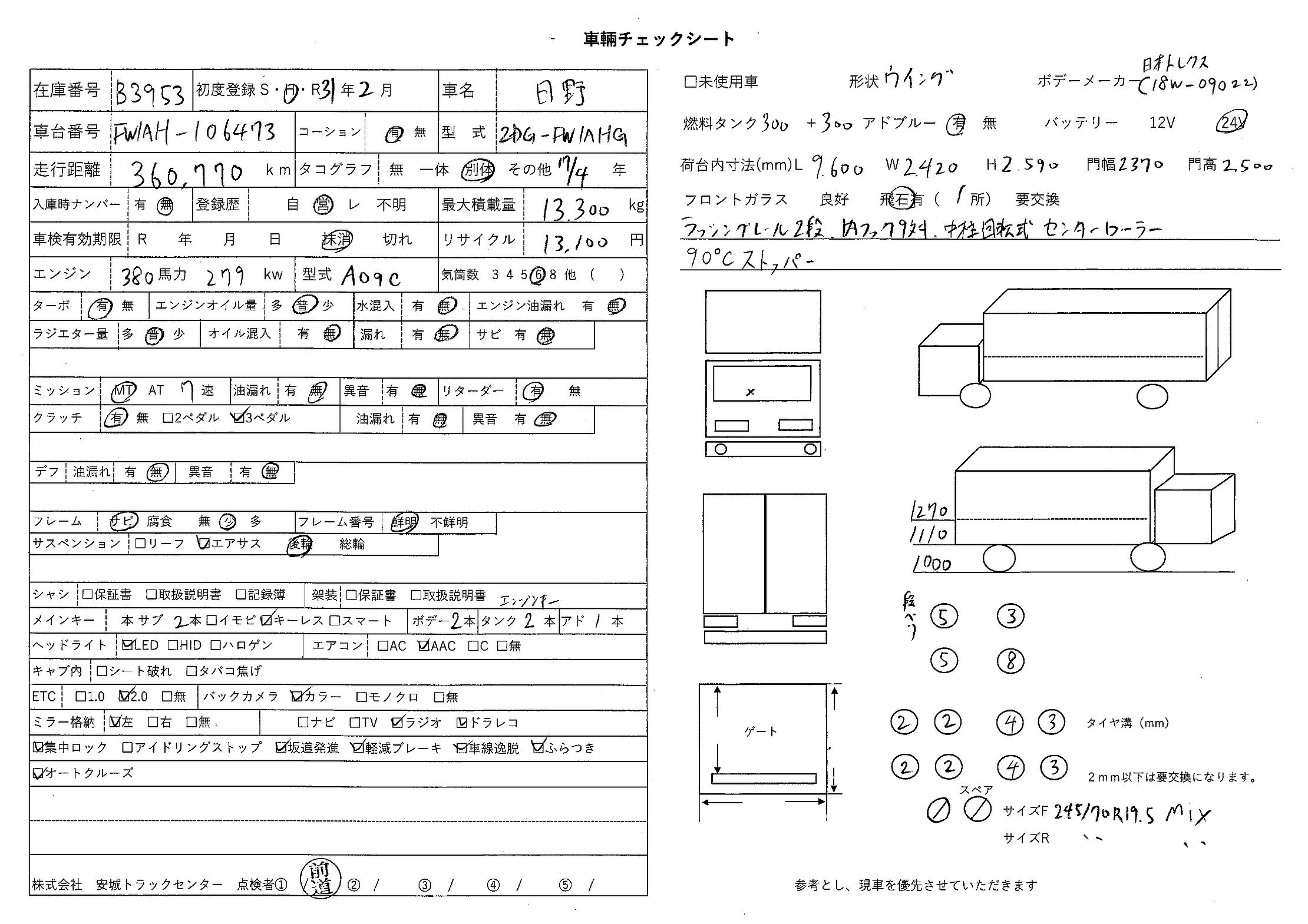 | 備考 | 後輪エアサス 電磁リターダ バックアイカメラ 日本トレクス ラッシングレール2段 内フック9対 中柱回転式 センターローラー 90度ストッパー |