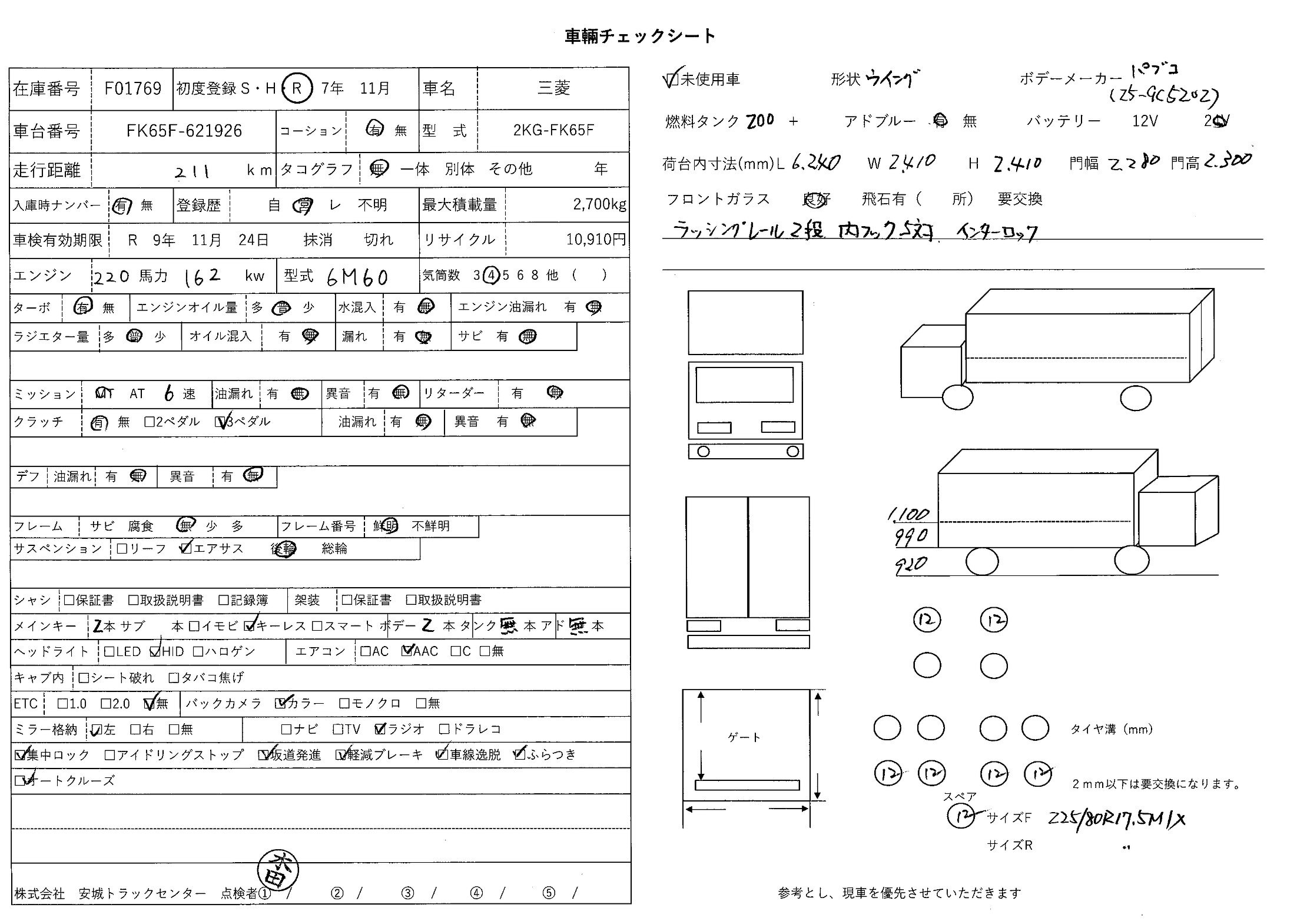 | 備考 | 登録済未使用車 後輪エアサス バックアイカメラ パブコ(25-9C5202)ラッシングレール2段 内フック5対 インターロック |