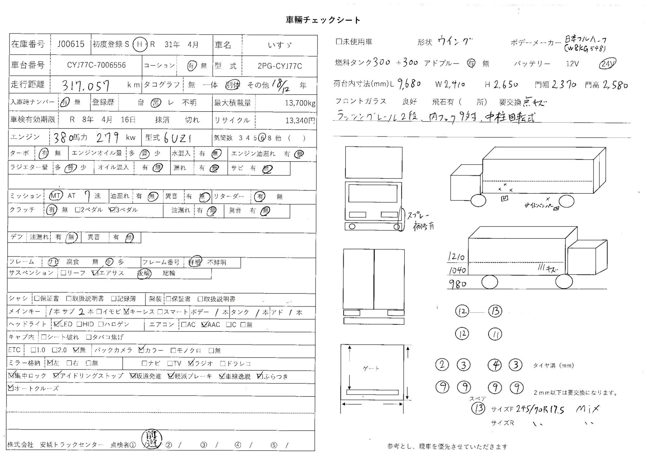 | 備考 | 後輪エアサス 電磁リターダ バックアイカメラ 日本フルハーフ(W8KG548)ラッシングレール2段 内フック9対 中柱回転式 |