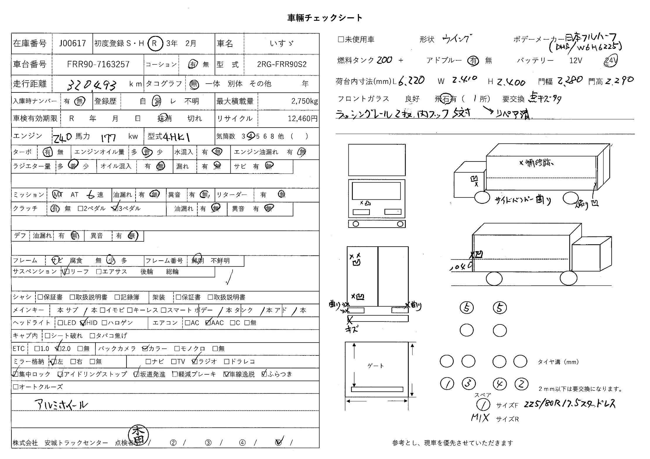 | 備考 | 日本フルハーフ(DMS/W6H6225)ラッシングレール2段 内フック5対 アルミホイール バックアイカメラ |