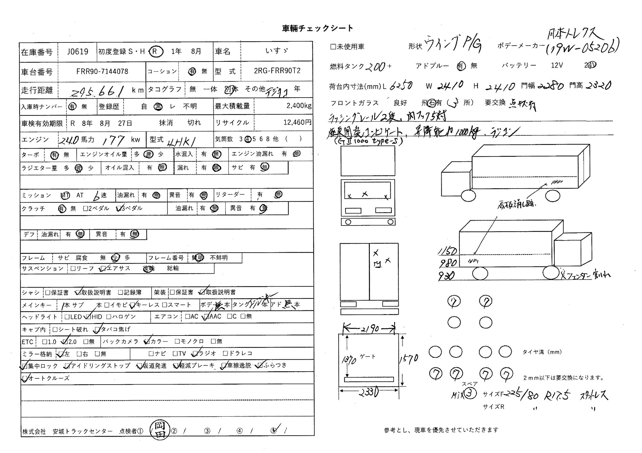 | 備考 | 62ワイド 後輪エアサス バックアイカメラ 日本トレクス(19W-05206) ラッシングレール2段 内フック5対 極東開発コンビゲート(GII1000type-s)昇降能力1000kg ラジコン |