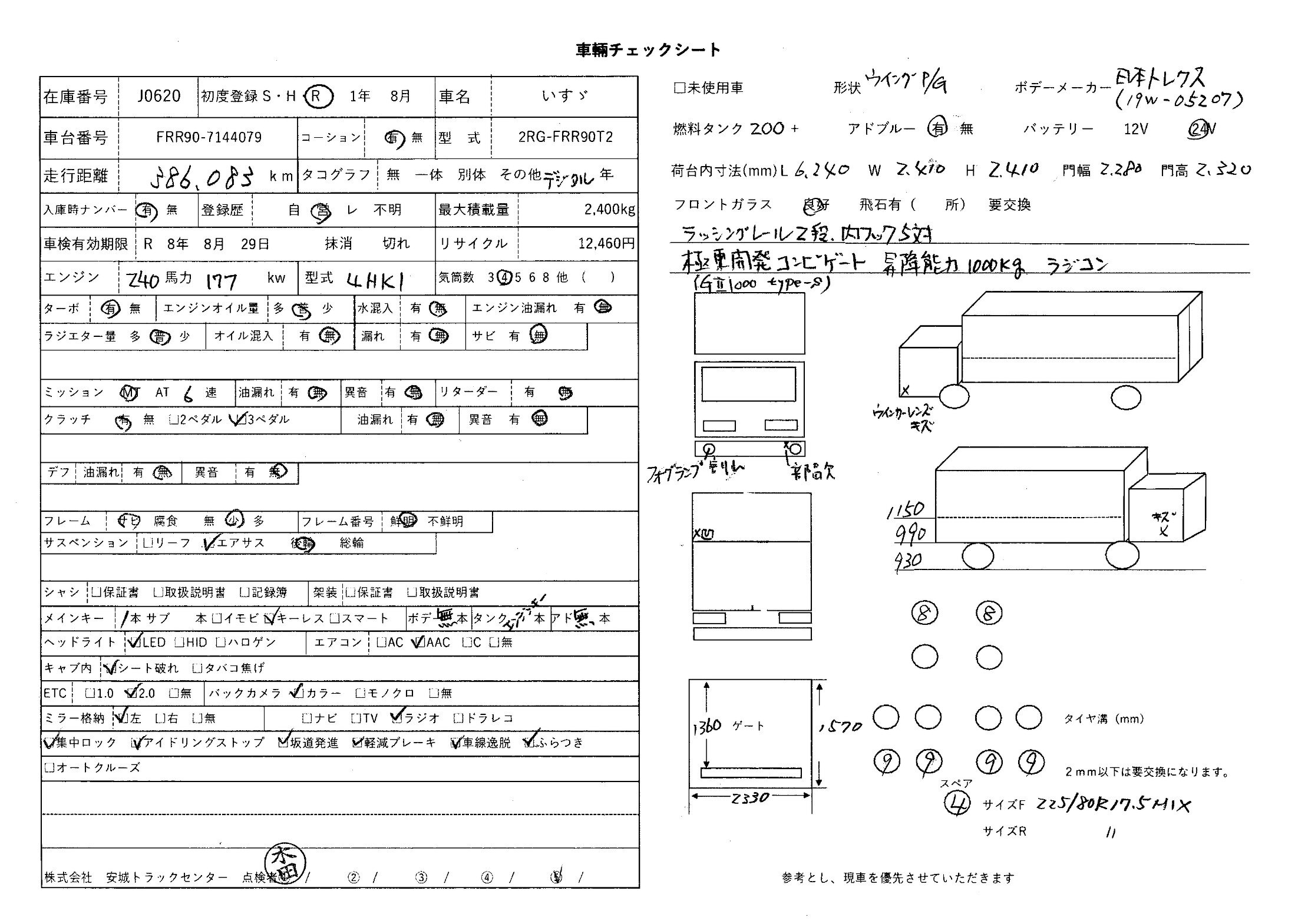 | 備考 | 62ワイド 後輪エアサス バックアイカメラ 日本トレクス(19W-05207)ラッシングレール2段 内フック5対 極東開発コンビゲート(GII1000 type-s)昇降能力1000kg ラジコン |