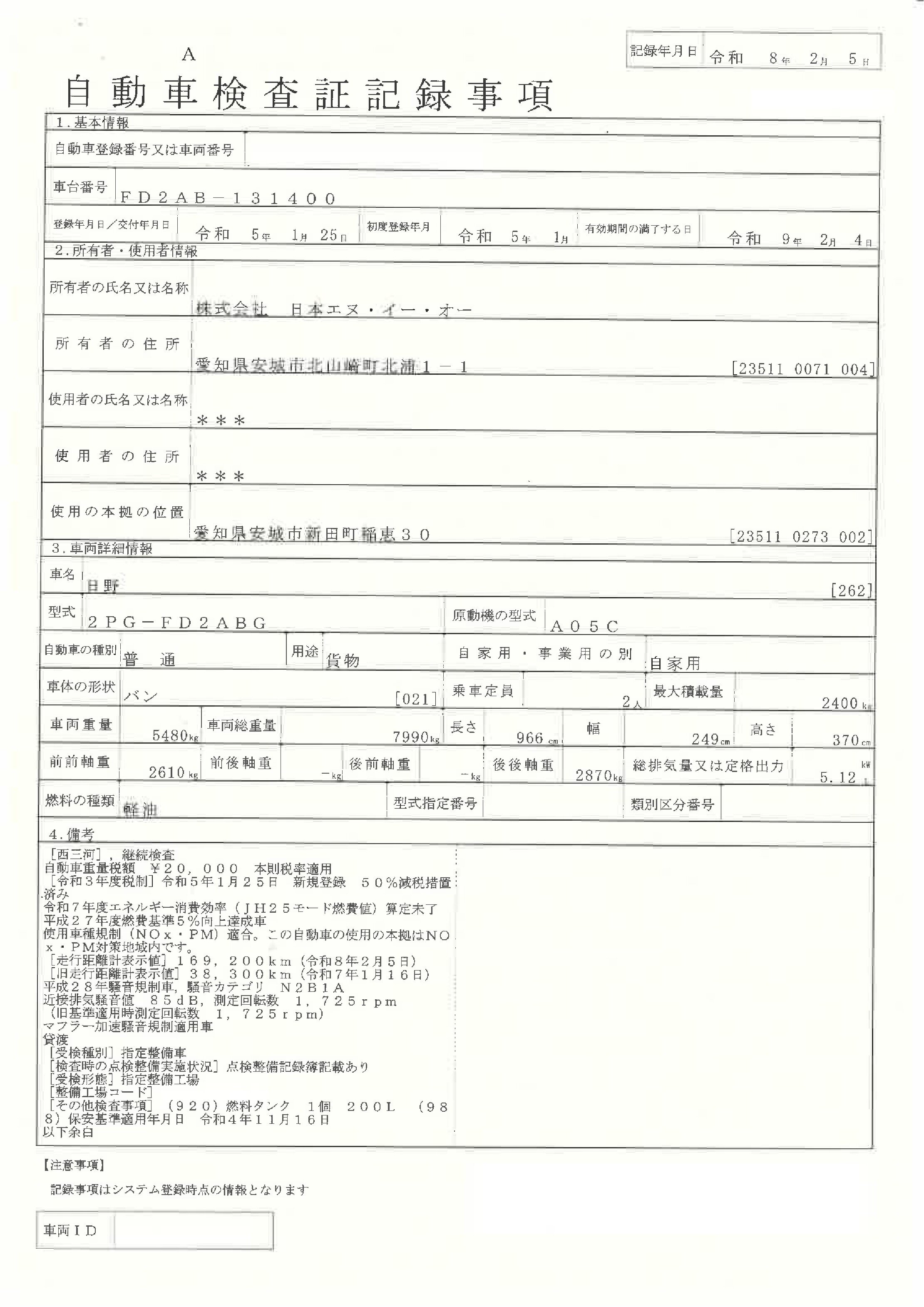 車検証・状態表